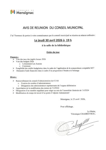 Prochain conseil municipal jeudi 30 avril 2026 à 19 h à la salle de la bibliothèque